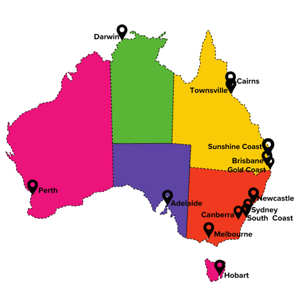 QLD encompasses Brisbane, Sunshine Coast and Gold Coast, as well as Townsville and Cairns.