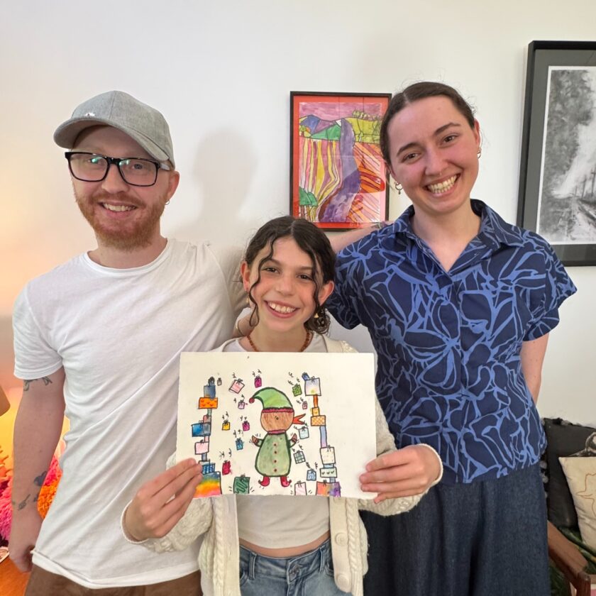 Pictured: Imogen with her artwork, with our Senior Philanthropy Coordinator Emma Barham and Community Engagement Coordinator Scott White.