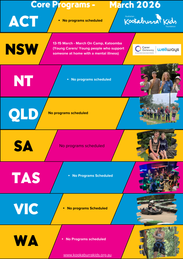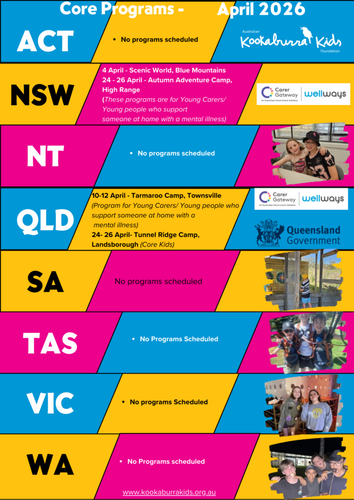 Is our program supporting young people impacted by family mental illness. All young people 8-18 from a family impacted by mental illness, even without a formal diagnosis are eligible to express interest in one of our Core Kids programs.