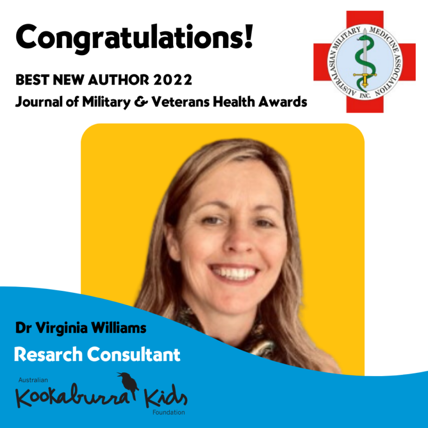 | Dr Virginia Williams has been honoured as BEST NEW AUTHOR at the 2022 Journal of Military and Veterans’ Health Awards for her work with the Australian Kookaburra Kids Foundation. Dr Williams received the award for her paper which looks at changes in perceptions about mental health and help-seeking intentions following a Kookaburra Kids program for young people living in current serving and ex-serving military families. We are immensely proud of her accomplishments and her commitment to making a difference in the lives of young people. We are also very humbled by Dr Williams’ generous donation of her prize money to enable more young people to access Kookaburra Kids’ programs. Join us in congratulating Dr Williams on this achievement. Read Dr Williams’ paper here. A big thank you to the Australian Government Department of Veterans’ Affairs for supporting this important work with young people living in current serving and ex-serving Defence families. We would also like to thank the Journal of Military and Veteran’s Health for its commitment to publishing research relating to the mental health and wellness of our Defence community. |